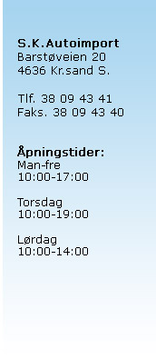 S.K.Autoimport sitt bruktbillager ligger stort sett på ca. 20 biler. Kvalitetsbiler av nyere årgang. Kom innom for gjennomgang eller se våre biler på finn.no.